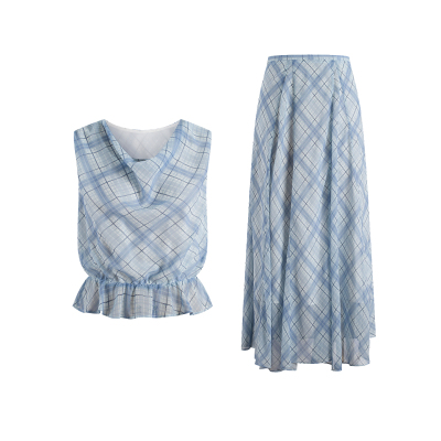 HeyDress法式格纹气质套装女夏季荡领花边上衣高腰立体斜裁半身裙